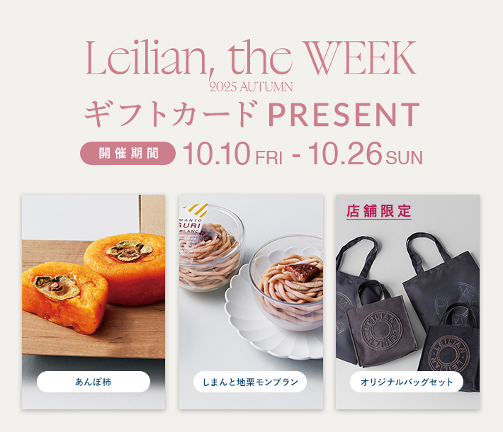 税込55,000円以上お買い上げいただいた方に、選べるギフトをご用意いたしました。レリアン公式オンラインストアでは先着40名のお客様に、旬の味わいに心ほぐれるスイーツ2品からお好きなものをお選びいただけるギフトカードをプレゼントいたします。※セールは対象外となります※公式オンラインストアにてご注文分のノベルティ(ギフトカード)は